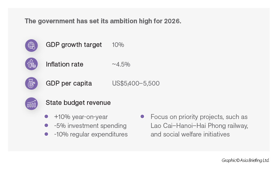 Vietnam has set ambitious targets to sustain growth through 2030, aiming for over 8 percent average annual GDP growth, at least 10 percent annually in 2026–2030, and per capita income of about US$8,500 by 2030, rising to roughly US$38,000 by 2050. |