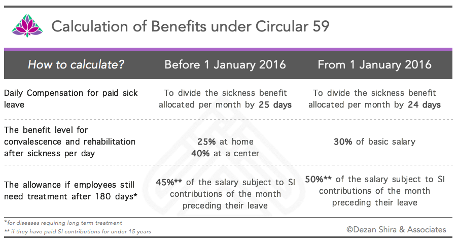 Of great importance for employers, leave compensation has been increased under Circular 59. The specifics of these increases, which are outlined below, cover costs pertaining to general sick leave, rehabilitation following an illness or injury, and long term disability. The adjustment of these figures will disproportionally impact investors with operations involving substantial amounts of labor.