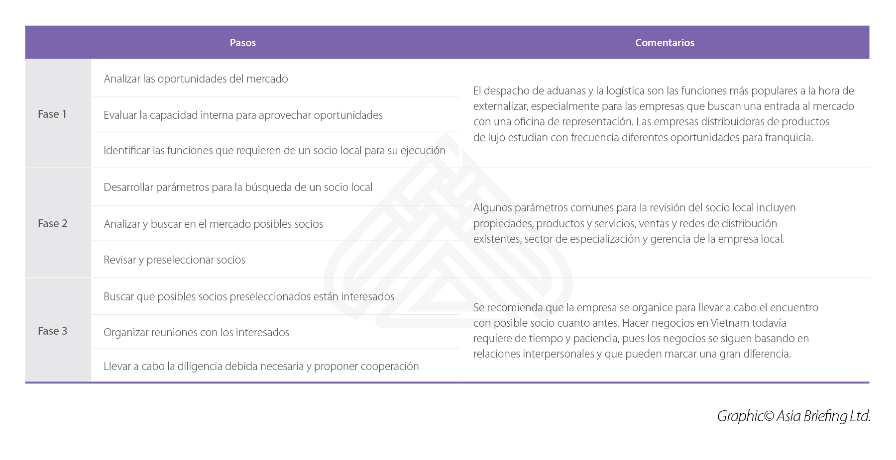 Las empresas interesadas en oportunidades de distribución en Vietnam con frecuencia llevan a cabo o encargan un informe del mercado vietnamita para comprender mejor qué funciones externalizar y qué posibles socios están mejor posicionados para cumplir con estas funciones. Los informes de búsqueda de socios de negocios por lo general se llevan a cabo a través de un proceso de tres fases que se describe a continuación