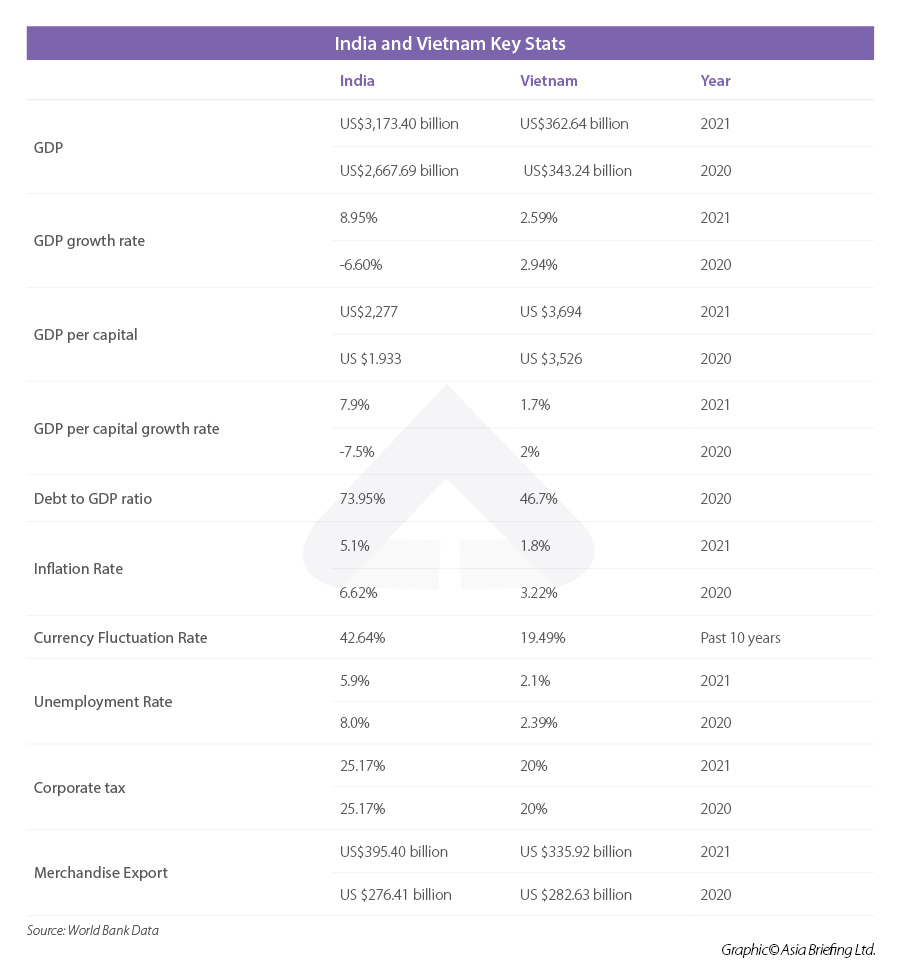 El hecho de que la India sea la tercera economía más grande de Asia por sí solo confiere al país una importante ventaja competitiva. Una gran economía conlleva un gran mercado nacional, un amplio abanico de consumidores y una mano de obra abundante y barata para el extranjero (como la tasa de desempleo de la India es inferior a la de Vietnam, la mano de obra cualificada en la India estará disponible a un precio más bajo).
