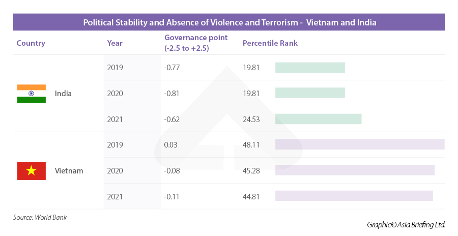 En este sentido, India tiene menor estabilidad política que Vietnam. Además, el índice de estabilidad política del Banco Mundial, que refleja la posibilidad de una transferencia desordenada del poder gubernamental, conflictos armados, protestas violentas, disturbios sociales, tensiones, terrorismo internacional, así como competiciones étnicas, religiosas o regionales, indica el mismo argumento: