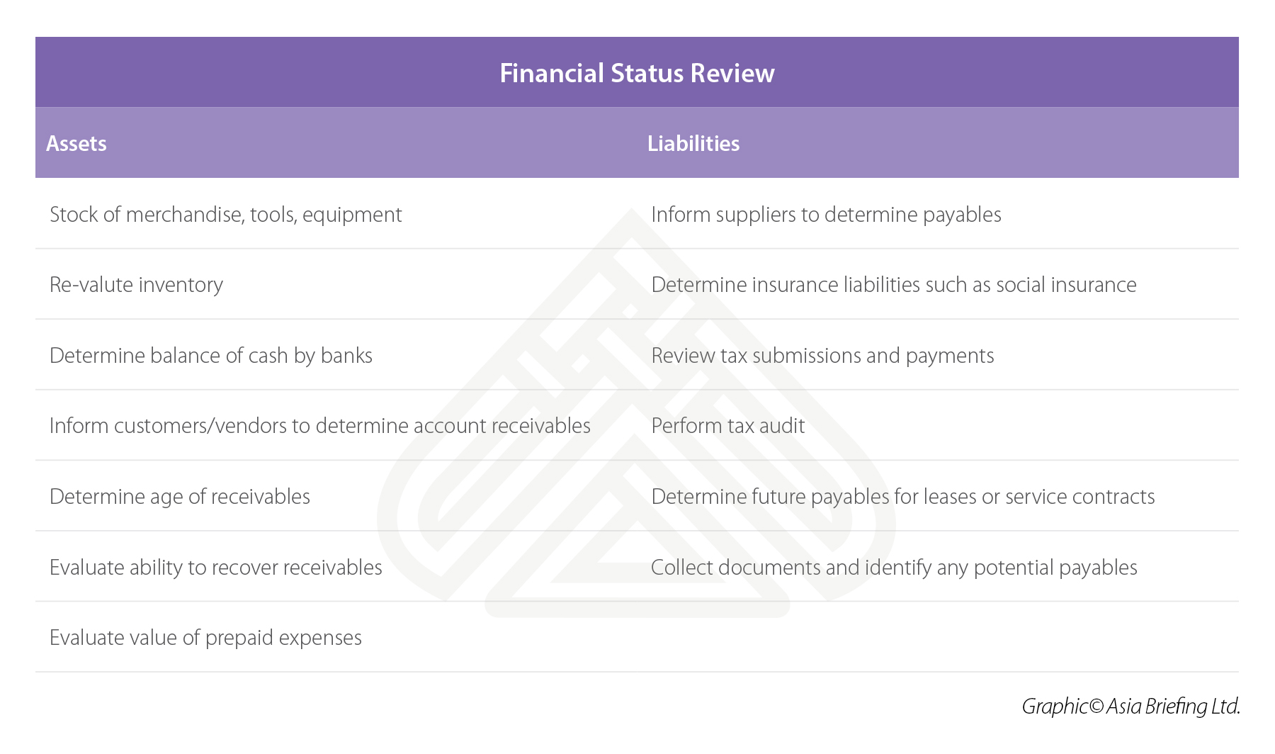 Financial diligence can be broken down in two parts: assets and liabilities.