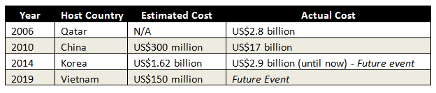 It seems clear that the estimated cost put forward does not reflect the actual cost borne by previous hosts of the Asian Games: