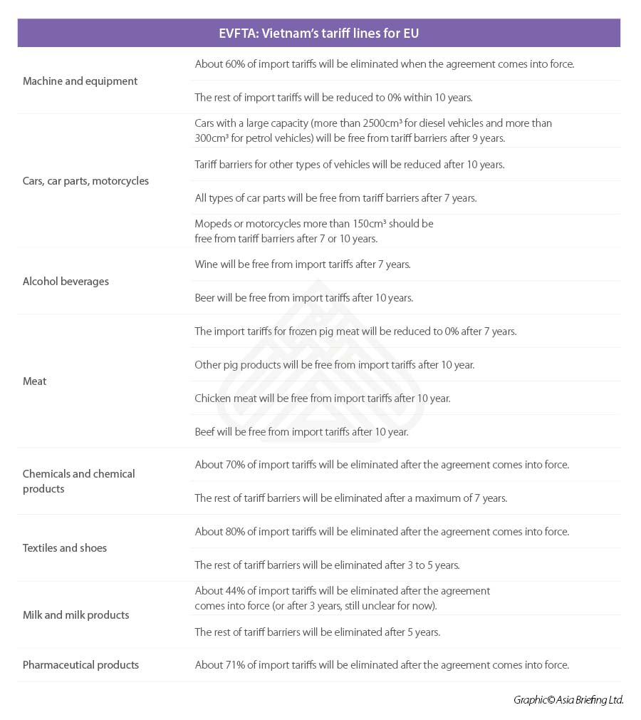 A preliminary overview of the product categories affected by the EVFTA can be found below.