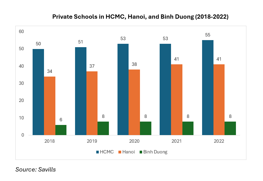 As of 2022, the number of private schools in Vietnam remained significantly lower than public schools. For example, in Hanoi, only 41 out of 2,801 schools were private, while Binh Duong had 8 out of 715, and Ho Chi Minh City (HCMC) had 55 out of 2,346. Most private schools in Hanoi and HCMC were either pre-schools or compulsory schools, with kindergartens representing the largest share in Binh Duong.