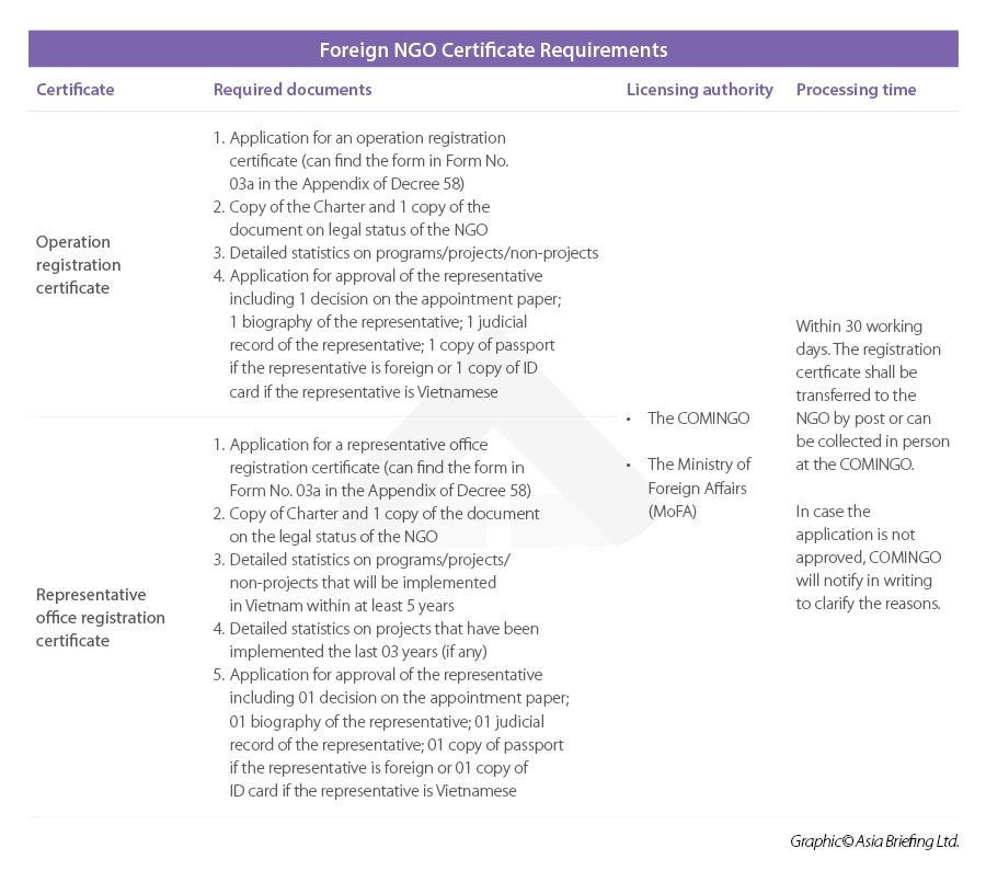 In order to receive the required designation, an NGO must abide by the country’s tight regulations and ensure all activities are consistent with Decree No. 58/2022/ND-CP. The decree covers registration and management for setting up.