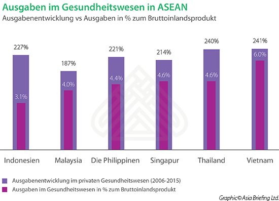 Ein großer Teil des starken Erfolges Vietnams in gesundheitsbezogenen Indikatoren, kann dem Engagement für Gesundheitsdienstleistungen – sowohl auf individueller als auch auf staatlicher Ebene – zugeschrieben werden. Nicht nur die privaten Gesundheitsausgaben sind schneller gestiegen als in anderen wesentlichen ASEAN-Staaten in den letzten Jahren, sondern die staatlichen Ausgaben als Teil des BIPs sind auch angestiegen.