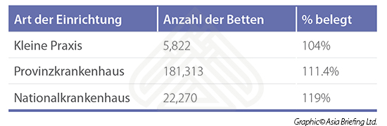 Die folgenden Statistiken von Vietnams Statistikamt artikulieren, inwieweit die bestehende Infrastruktur in den letzten Jahren überlastet worden ist. Die Überfüllung von medizinischen Einrichtungen zusammen mit veralteten medizinischen Geräten und mangelnden qualifiziertem medizinischen Personal, hat zur Verlängerung von Behandlungsdauern geführt; und damit Zugang zu hochwertiger Behandlung erschwert.