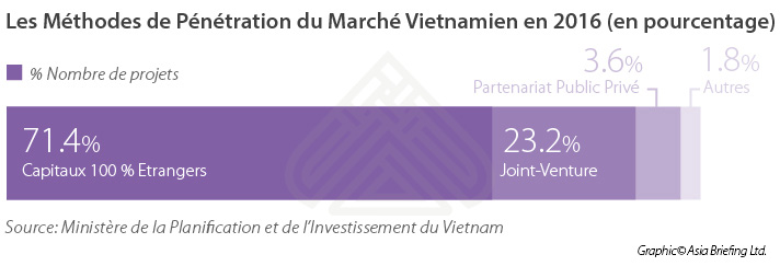 Bien que les FOE puissent constituer une stratégie d’entrée sur le marché efficace, les opportunités d’investissement sont restreintes dans certains secteurs dits « conditionnels » qui imposent des plafonds de participation étrangère. En outre, le développement de réseaux de vente et de marketing sera exclusivement entre les mains de l’entreprise étrangère. Les investisseurs dans les domaines de la vente et de la distribution de biens de consommation devraient examiner attentivement leurs options avant de plonger dans le marché vietnamien.