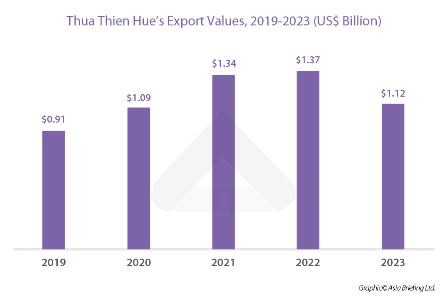 In 2023, Thua Thien Hue’s exports amounted to US$1.12 billion. Although there was a slight decrease in year-on-year growth, which is potentially due to increasing difficulties of the global economy, a slow COVID recovery, and ongoing geopolitical conflicts. The figures still represent a positive recovery, surpassing the province’s pre-COVID-19 pandemic export value.