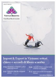 In questo numero di Vietnam Briefing, esaminiamo gli aspetti chiave dell’import e dell’export del Paese, focalizzato sul tessile, sulla telefonia e sulla componentistica delle automobili. Inoltre, analizziamo le opportunità per il Vietnam alla luce della sua inclusione in blocchi commerciali regionali multilaterali, prima di esaminare l’Accordo di Libero Scambio tra lâUnione Europea e il Vietnam nel dettaglio. Infine, diamo una panoramica dei requisiti per la creazione di una società commerciale in Vietnam.
