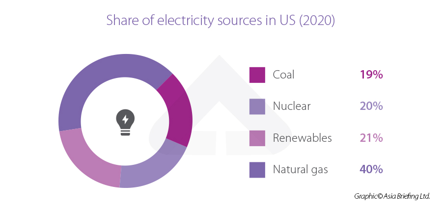 The US’ electricity needs has been met by a combination of different sources, including coal, natural gas, renewable sources, and nuclear power. The market share of the sources can be seen in the below infographic.