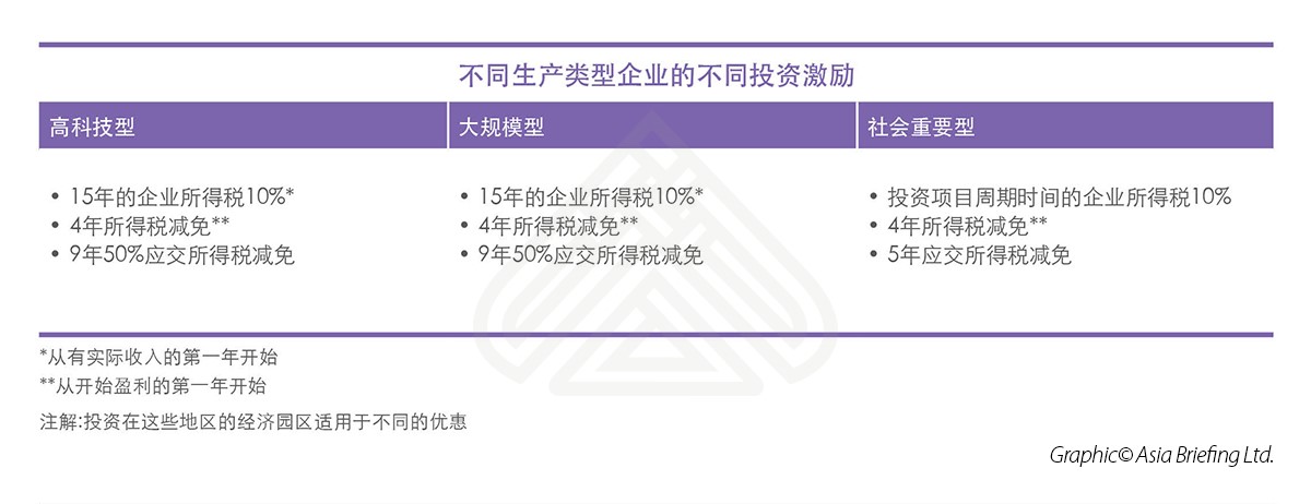 大多数经济园区为符合条件的投资者提供一定时间的免税期。在一些位于不发达地区的园区,投资者将生产和运营设立在园区内即可享受免税期,同时还享受所得税优惠。