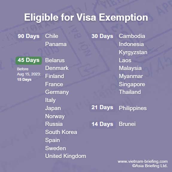 Darüber hinaus wird Besuchern aus ausgewählten Ländern das Privileg der Visumbefreiung gewährt, dass es ihnen ermöglicht, Vietnam für einen längeren Zeitraum von bis zu 45 Tagen (In wenigen Fällen 90 Tagen) zu erkunden.