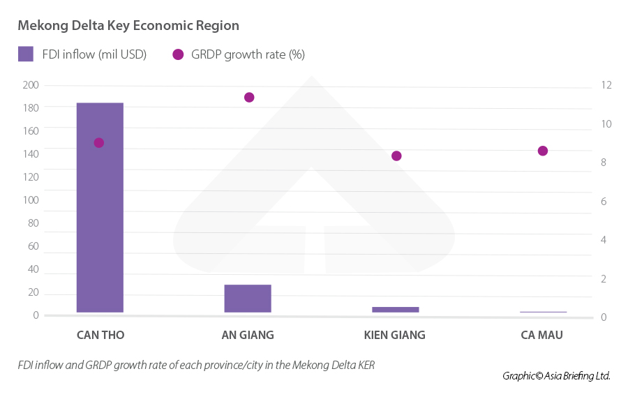 All four provinces in the Mekong Delta have fairly equal contributions to GRDP, and growth rates range from 8 to 11 percent.