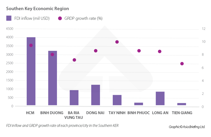 The southern KER includes eight provinces and cities: Ho Chi Minh, Binh Duong, Ba Ria- Vung Tau, Dong Nai, Tay Ninh, Binh Phuoc, Long An, Tien Giang. It is home to a large number of industrial parks, supermarkets, and commercial centers of many major retail groups.Ho Chi Minh contributes 15.5 percent of Vietnam’s GDP and 46 percent of the southern KER’s GRDP, which is three times higher than Binh Duong, the second-largest province in the region. In 2022, all eight provinces had growth rates ranging from 7 to 9 percent.