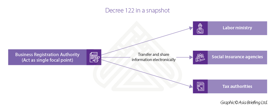 The Decree also states that government agencies in charge of labor, social insurance, and tax will not request the enterprise for copies of the enterprise registration certificate but will rather approach the BRA. However, state agencies would be allowed to ask for the enterprise name, identification number, and any administrative procedures.