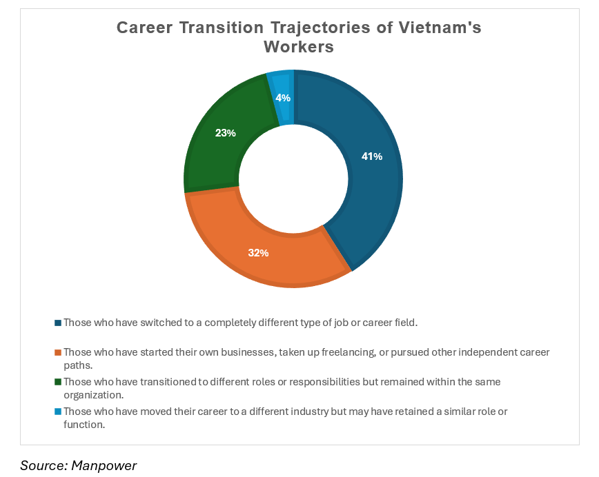 Vietnamesische Arbeitnehmer betrachten Karrierewechsel zunehmend als strategischen Schritt für berufliches Wachstum. Fast die Hälfte der Befragten von Manpower hat einen Karrierewechsel geplant oder bereits absolviert, wobei 72 Prozent von positiven Auswirkungen auf ihr Wohlbefinden und ihre Arbeitszufriedenheit berichten. Häufige Hindernisse für den Wechsel sind jedoch: