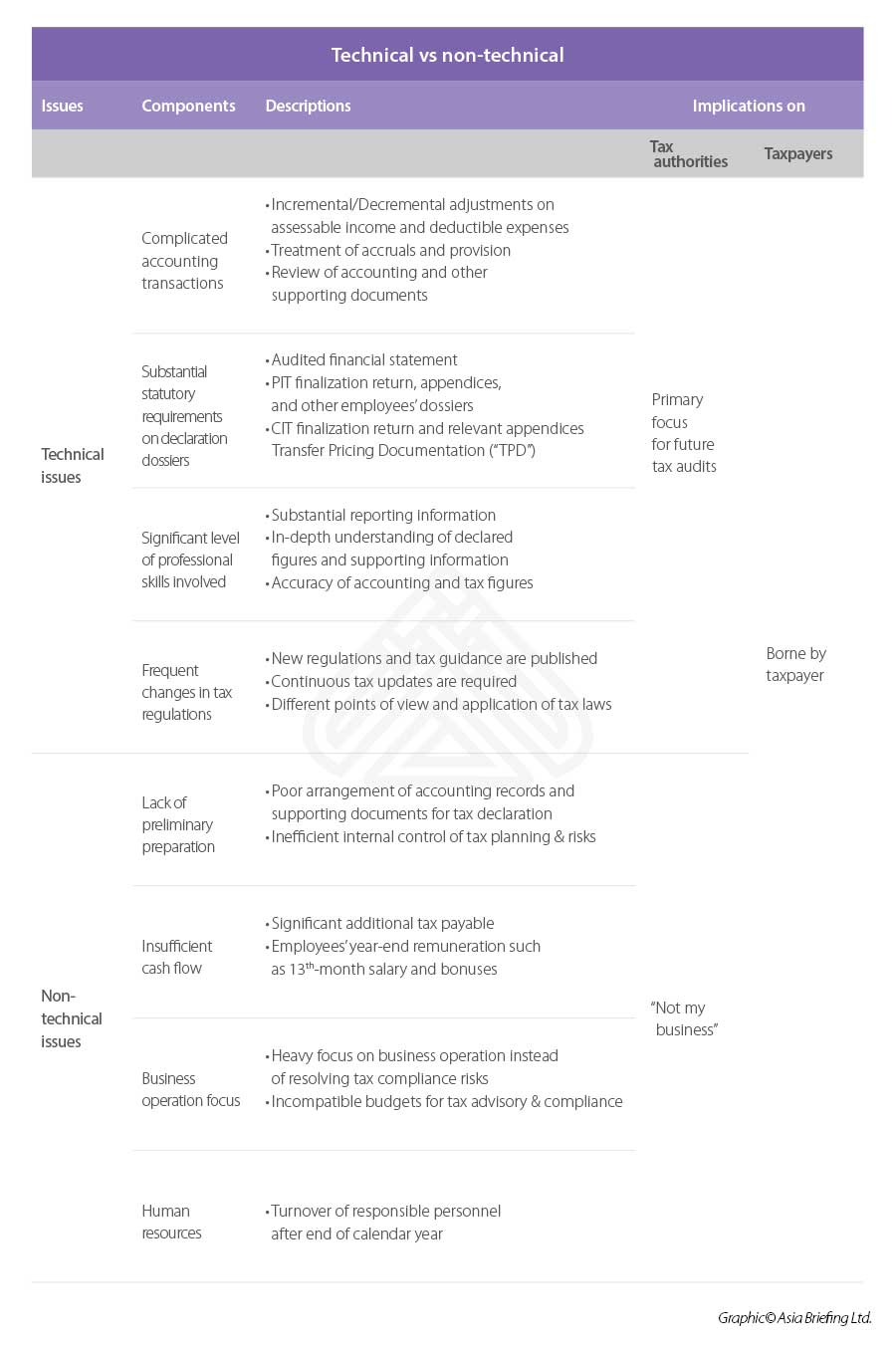 Technical issues involve complicated accounting transactions & adjustments, substantial requirements on documentation and frequent changes in applicable tax guidance, which are the primary focus of the tax authorities in future tax inspections or tax audits. Whereas, non-technical issues are the taxpayers’ internal problems within the business that can affect their tax compliance status.
