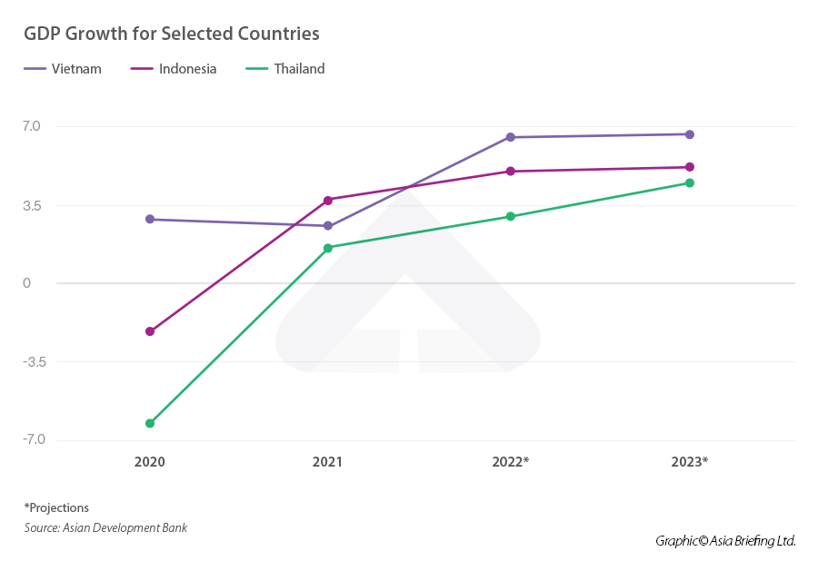 After vaccinating most of its population and suffering the sharpest declines in GDP. Vietnam reopened its economy on October 1, 2021 and decided to follow a live with COVID approach. This allowed factories and businesses to resume operations; Vietnam slowly relaxed border control measures allowing foreigners entry without quarantine and allowing business and tourist travel.
