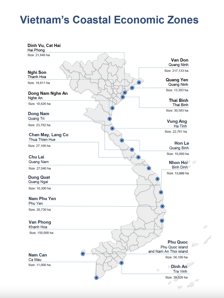 In line with this initiative, the Vietnamese government has decided to develop three SEZs located in the North, Central, and Southern regions of the country: Van Don in Quang Ninh province, North Van Phong in Khanh Hoa province, and Phu Quoc in Kien Giang province. Each SEZ will focus on specific sectors: