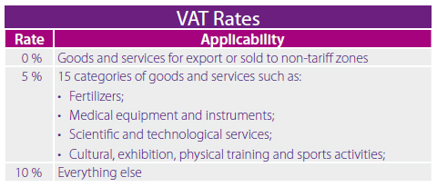 Value-added tax (VAT) is imposed on the supply of goods and services at three different rates: 0 percent, 5 percent and 10 percent (the standard rate).