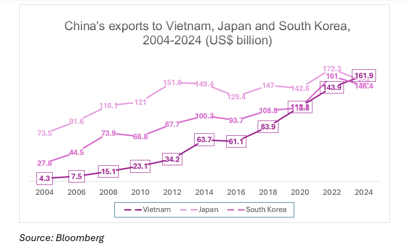 In 2024, China’s exports to Vietnam reached a record US$163 billion, largely due to companies relocating supply chains to mitigate risks. This shift has attracted significant investments from major electronics manufacturers to assemble products in Vietnam. Additionally, Vietnam also performed impressively in other regions, with new potential in African and South American markets.