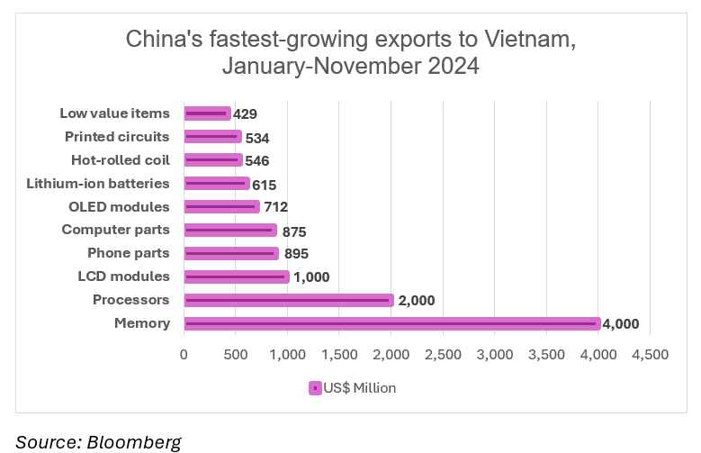 Experts attribute the surge to increased exports of components from China to Vietnam, where they are assembled into final products and re-exported. According to Bloomberg, from January to November last year, eight of the top 10 products with the highest export growth from China to Vietnam were electronic components.