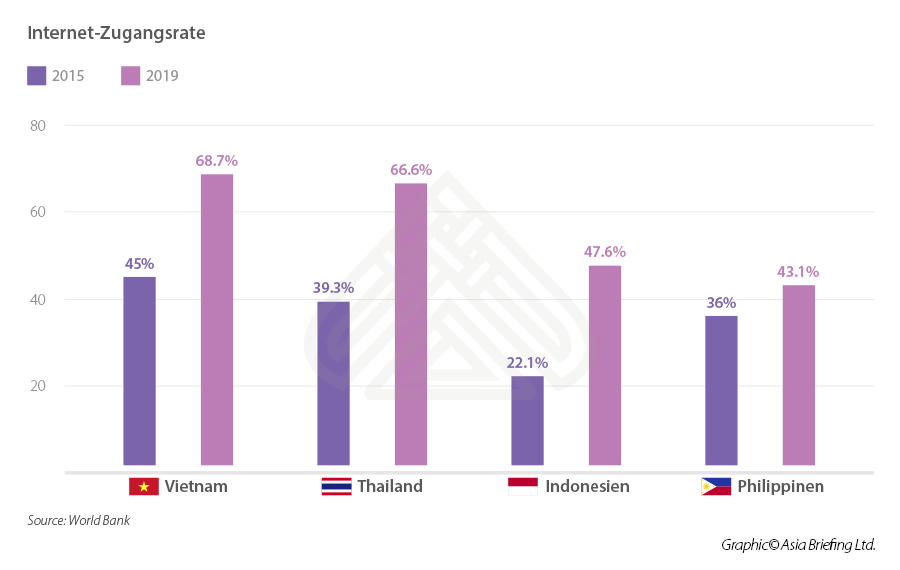 Barzahlungen sind in Vietnam nach wie vor das Mittel der Wahl. Im Jahr 2019 verfügten nur 41 Prozent der Erwachsenen im Land über ein Bankkonto, wobei sich die meisten von ihnen in den Städten befanden. Es gibt jedoch Anzeichen dafür, dass die Nachfrage nach digitalen Finanzdienstleistungen wahrscheinlich steigen wird. Nach Angaben der Weltbank hatten nur 45 Prozent der vietnamesischen Bevölkerung Zugang zum Internet. Diese Zahl stieg bis 2019 auf 68,7 Prozent.